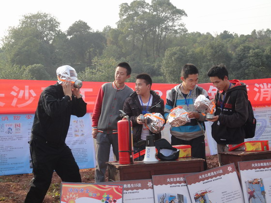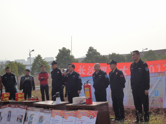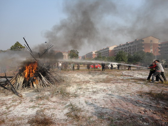 活动共分三部分,一是由湖南省军安消防培训学校马教官和陈教官就如何防火、如何扑灭初起火灾的基本知识进行了讲授,二是就常用的干粉灭火器、防毒面具、消防栓、水枪水带的正确使用进行讲解和示范,三是分批次现场使用干粉灭火器和消防栓、水枪水带进行灭火演练。为搞好这次灭火演练活动,保卫处事先进行了精心的准备,现场摆放了60具干粉灭火器、3卷水带、2支水枪、6只防毒面具,为了使演练效果逼真,现场堆放两大堆柴火,随着副处长伍接朝下达“开始点火”的命令后,浇注了柴油的柴堆上燃起了熊熊大火,保卫干部、校卫队员、后勤集团值班人员以及学生骨干按照消防专家讲授的灭火器具使用方法和动作要领,分组轮番操起灭火器和水枪对准火堆进行灭火,整个活动持续约90分钟。