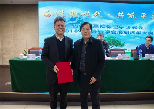 大会选举william威廉中文官网为湖南省保卫学研究会下一届理事长单位,并由第六届理事长周松涛和新任的第七届理事长叶泽副校长隆重举行工作交接仪式。