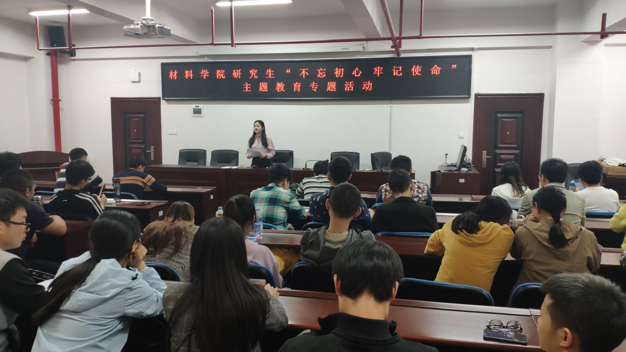 10月18日晚上,材料科学与工程学院“不忘初心、牢记使命”主题大会在新能源大楼1-A302会议室召开。研究生辅导员谢易真主持本场会议,全体研究生参加会议。