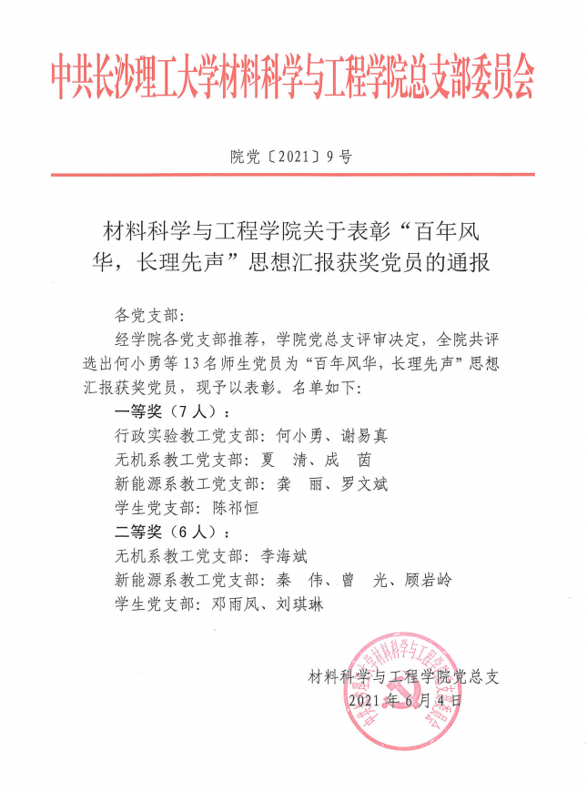 材料科学与工程学院关于表彰“百年风华,长理先声”思想汇报获奖党员的通报(院党〔2021〕9号)