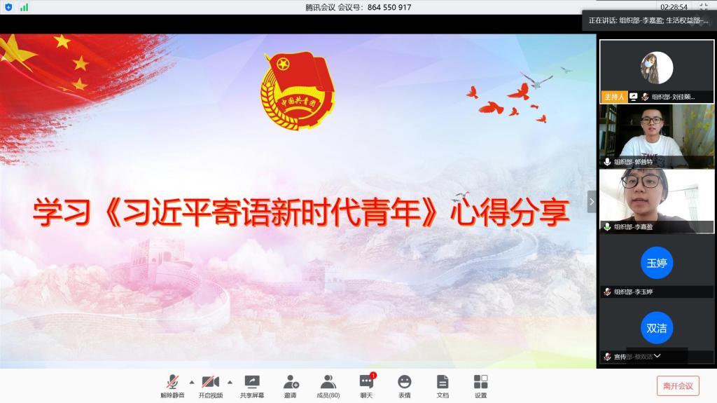 会议伊始,全体成员观看了“让青春为祖国绽放”直播的第一篇章出彩青春以及五四青年节特别团课,观看了各行业杰出青年代表的青春模样。随后,与会人员热议习近平总书记五四青年节寄语,唐青表示作为新时代新青年,要勇于发出自己内心的声音,在更深的层次上分享自己的所学所想,号召同学们积极学习五四精神,以五四精神为指引,培养高尚人格,为国家和社会做出应有的贡献。