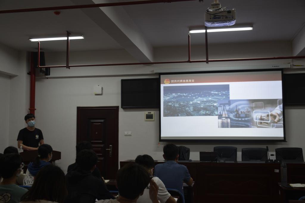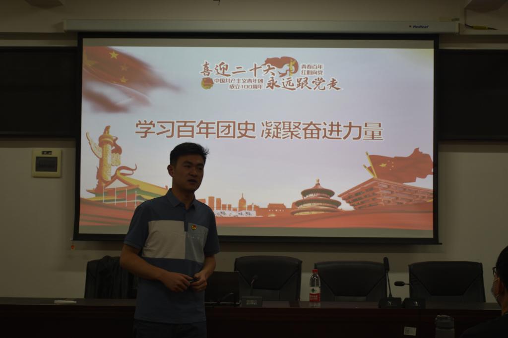 活动伊始,全体起立,奏唱团歌。随后,陈鑫林以“学习百年团史,凝聚奋进力量”为主题讲授专题团课,他从共青团的诞生背景、共青团的发展历史以及新时代的青年团员如何担当作为三个方面开始授课。首先,陈鑫林介绍了共青团成立时的社会背景,他指出在新文化运动和五四运动的影响下,广大进步青年要求改造社会的呼声响彻祖国大地,各地青年纷纷成立社团,探索救亡图存之路。在此背景下,1922年5月5日,在党的领导下,正式成立了中国社会主义青年团。随后,陈鑫林介绍了共青团的发展历史,在共青团的百年历程中,团组织经过中国社会主义青年团、中国共产主义青年团、中国新民主主义青年团等多个发展阶段,但不管在哪个阶段,中国青年始终坚定不移跟党走,为中国革命、建设和改革贡献了青年智慧、青年担当和青年力量。最后,陈鑫林为同学们解读了习近平总书记在纪念五四运动一百周年大会上对青年的寄语,希望同学们树立远大理想,热爱伟大祖国,担当时代责任,勇于砥砺奋斗,练就过硬本领,锤炼品德修为,积极投身实现中华民族伟大复兴中国梦的伟大实践,拥抱新时代、奋进新时代。