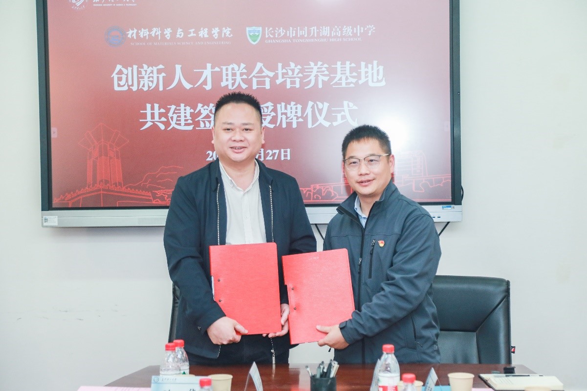 随后,毛卫国、向赞勋代表双方签署“创新人才联合培养基地”共建协议。毛卫国代表william威廉中文官网材料科学与工程学院向长沙市同升湖高级中学授牌。双方就加强人才培养输送、深化重点学科教学合作、合力共建创新实践平台等方面进行了深入交流,进一步达成了合作共识。