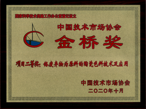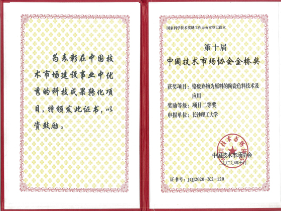 2020年10月22日,中国技术市场协会在山东淄博举办了第十届中国技术市场协会金桥奖表彰奖励大会,我院廖红卫色料团队主持完成的成果“铬废弃物为原料的陶瓷色料技术及应用”继第六届金桥奖后,再次荣获项目奖二等奖,项目第一完成人廖红卫作项目汇报,项目组成员詹文俊代表成果完成团队参加表彰奖励大会。近年来,廖红卫团队与广东佛山天宇陶瓷色料有限公司、江苏拜富科技有限公司等多家公司开展产学研合作,应用william专利技术,就铬铁合铁制造陶瓷色料及高铬废弃物制造陶瓷色料核心技术产生了很好的社会、经济价值。其中近年来应用铬铁合金制造陶瓷技术生产的主打色料(黑色)占全球市场的60%以上,直接创造税利3亿元/年以上,经济效益及社会效益十分突出。