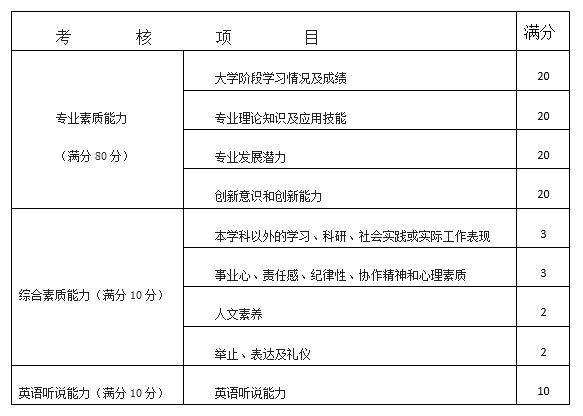 专业素质:①大学阶段学习情况及成绩;②全面考核对本学科(专业)理论知识和应用技能掌握程度,利用所学理论发现、分析和解决问题的能力,对本学科发展动态的了解及在本专业领域的潜力发展;③创新精神和创新能力。