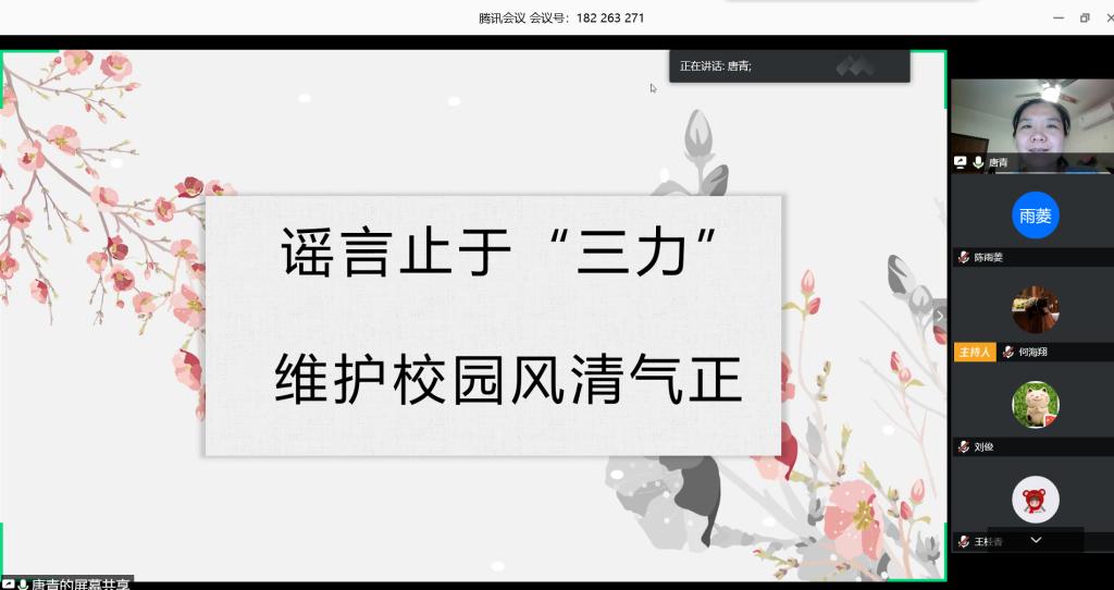 首先,唐青通过一则短视频引发全体党员思考,共同探讨疫情对当前生活造成了哪些影响,党员积极留言讨论。接着,唐青从疫情改变了什么,影响我们思考和判断的三个因素以及如何增强辨别力、执行力、引领力三个方面展开具体讲解。她指出此次疫情是一次大考,每一位党员要贯彻为人民服务的宗旨,主动完善自身思想体系,学会利用正确的理论武装头脑。最后,唐青通过自身实例勉励全体党员要在多元化的信息传播中,注重理性判断,勇于纠偏,思考正确的发声方式,充分发挥党员先进性的“辐射”作用,争当科学的传播者、谣言的粉碎机,自觉维护校园风清气正。