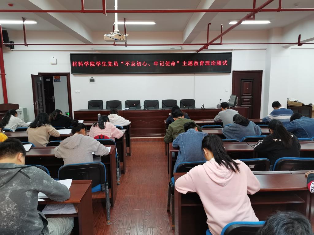 11月11日,材料学院组织研、本学生党支部成员在新能源一号楼开展“不忘初心、牢记使命”主题教育理论知识测试,全体学生党员参加。