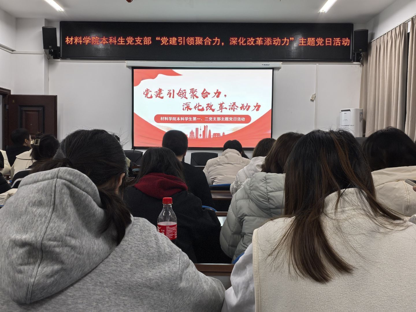 3月13日19:00,材料学院本科党支部于新能源1号楼908室开展“党建引领聚合力,深化改革添动力”主题党日活动,此次活动由党员张弘杰主持。