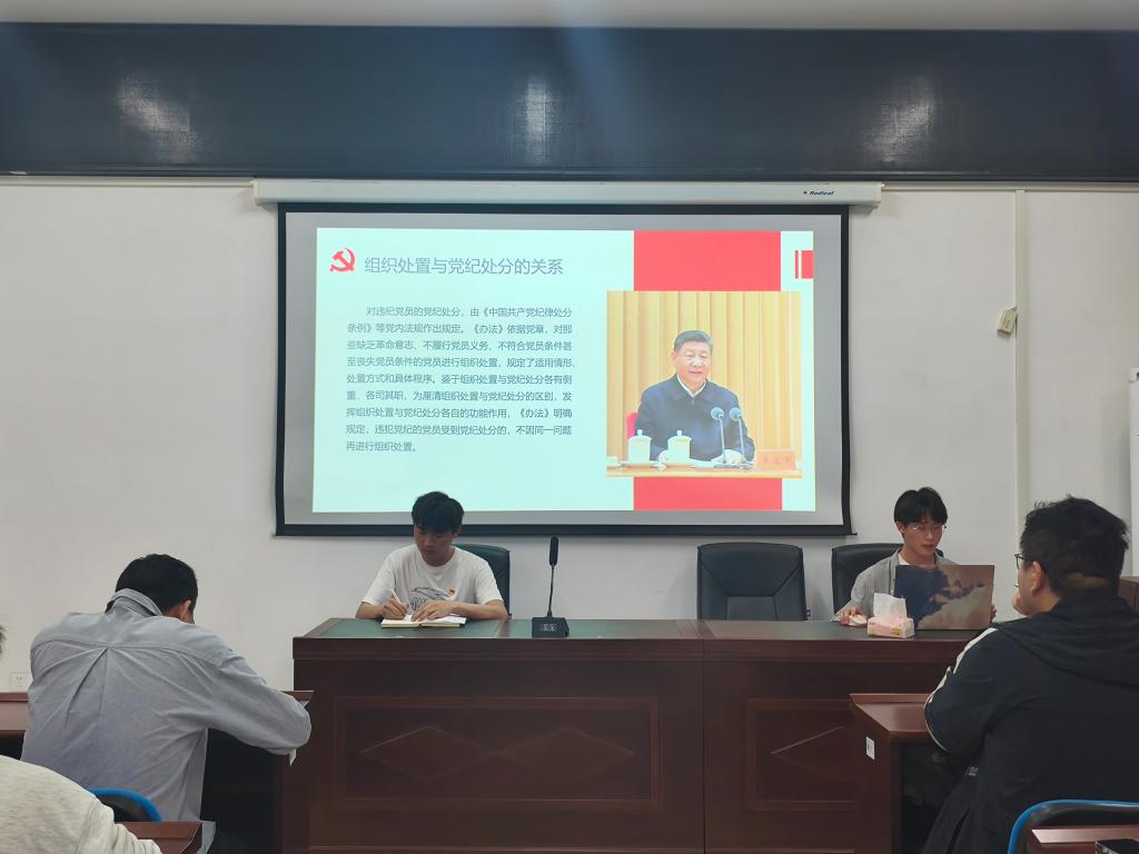 4月16日晚19:00,材料科学与工程学院本科学生第一党支部于新能源1号楼908室开展“以学促行强纪律,以严正风守初心”主题党日活动。本次活动旨在进一步强化学生党员纪律意识,提升党性修养。活动由党员崔哲主持。