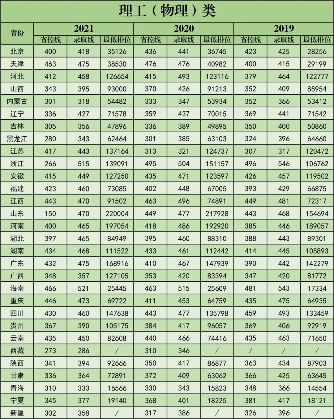 近三年在各省(市)录取分数及最低位次一览表