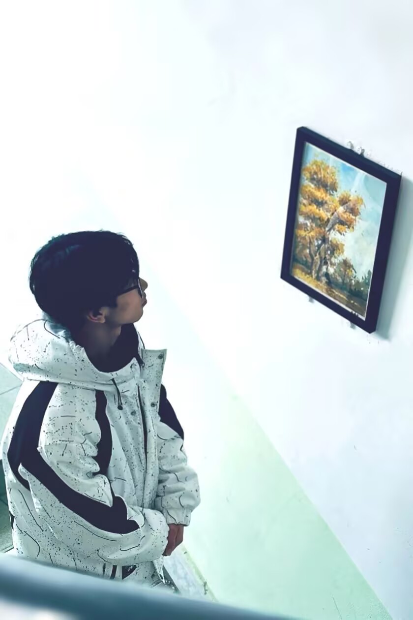 展览分为两个区域。二教东侧走廊展示了空间改造设计作品,这些作品巧妙地利用空间元素,创造出既实用又富有艺术感的展示空间。而西侧走廊则被打造成了一个挂画的雅致空间,每一幅画都悬挂在墙上,以其独特的笔触和色彩,诉说着属于它们自己的故事,让观者仿佛置身于一个梦幻般的艺术世界。