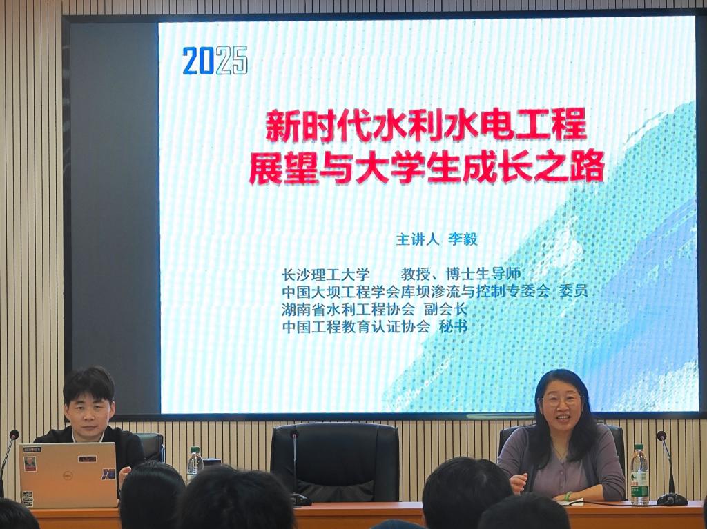 李毅教授结合全球气候变化、能源危机和地缘政治的大背景下,深入分析了水利水电工程相关行业当前面临的挑战与机遇。他指出,水利工程作为保障国家水安全的关键“战略屏障”,水电站在新时代正朝着智慧化、生态友好型方向加速迈进。李毅教授强调,青年学子应勇担使命,以创新为驱动,助力中国“大国工程”在全球持续引领。