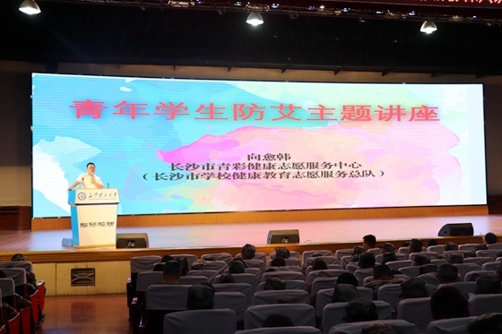 讲座中,天心区疾控中心结艾科科长陶荣琴、长沙市青彩健康志愿服务中心向愈韩、长沙市血液中心常杜三位专家分别围绕“结核病防治”、“防艾禁毒”和“无偿献血”,向大家详细讲解相关知识。会场气氛活跃,互动频繁,现场掀起了一片有奖竞答的热潮,同学们争先恐后举手抢答题目。