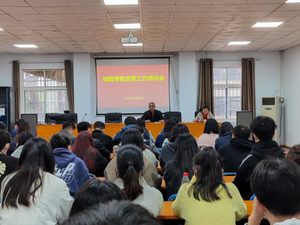11月22日,城南学院党委组织全体学生支部书记、支委开展党务工作培训,院党委书记李修春、副院长靳攀科、特邀党建组织员宋建社、姚跃华应邀出席,院党委副书记马丽主持培训。