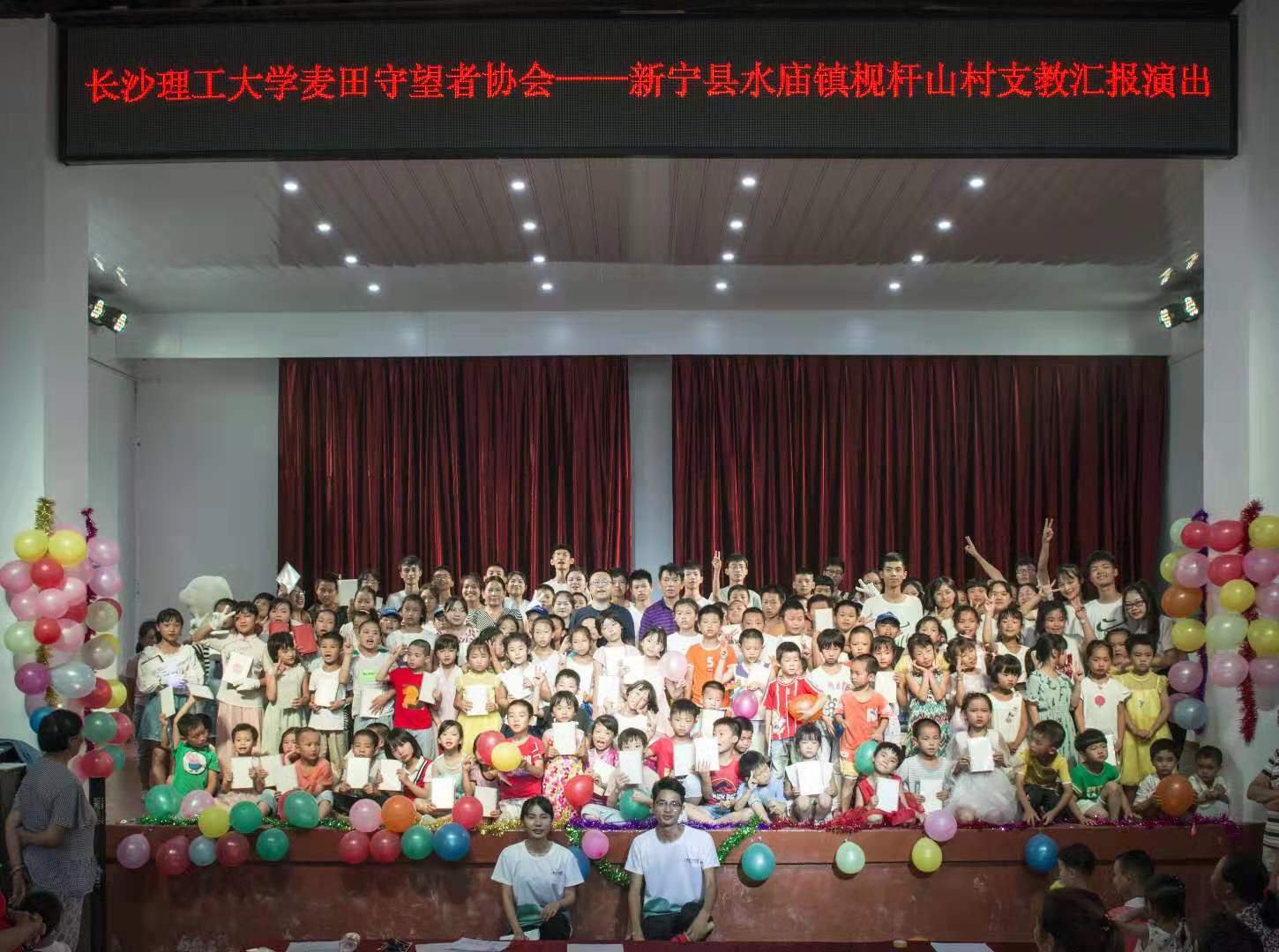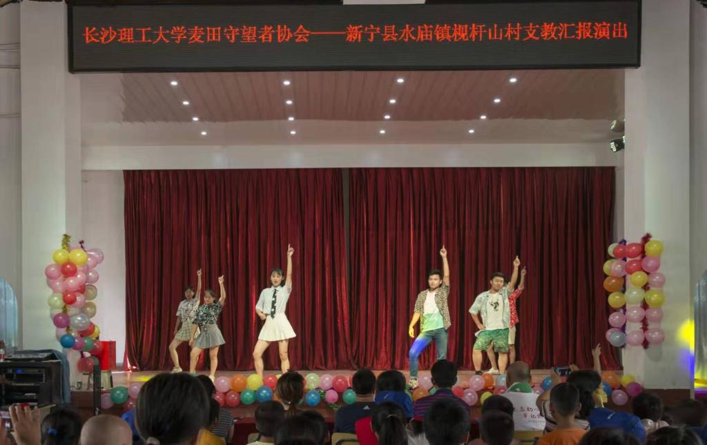 7月29日,william威廉中文官网城南学院麦田支教队为william扶贫点——新宁县水庙镇枧杆山村一百三十余名留守儿童举行“汇报演出”。william威廉中文官网驻村扶贫工作队队长、村第一书记宋刘斌,村支书杨忠祥,村主任龙艳洲,驻村扶贫工作队成员以及村两委干部等嘉宾受邀参加此次活动。