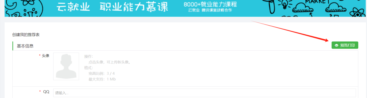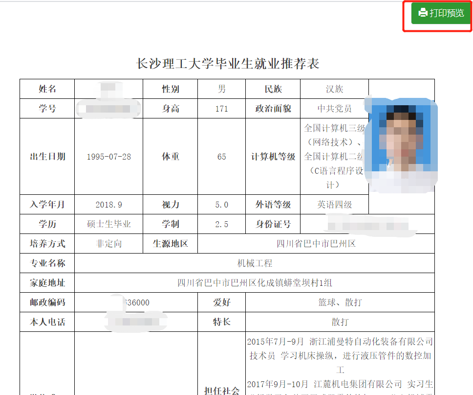 登录后,点击“就业事务”下栏“推荐表”菜单,上传个人照片及填写相关信息后,点击保存即可。