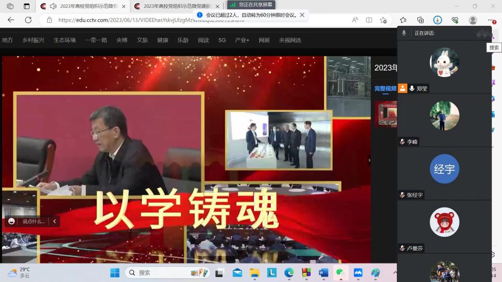 6月14日下午,计算机与通信工程学院组织学院领导班子及师生党支部集中收看由教育部思政司主办的“铸魂增智育新人 正风促干书新篇”2023年高校党组织示范微党课。本次活动突出党建引领作用,围绕落实立德树人根本任务,发挥基层党组织作用和党员干部先锋模范作用,引导党员干部和广大师生深刻思考“教育强国,高校何为”,激发使命担当。