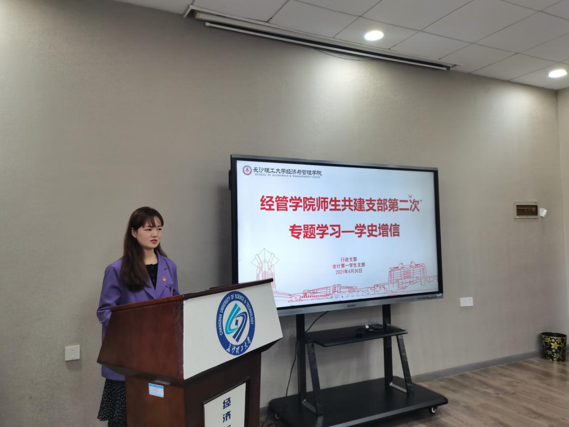4月30日上午,行政支部和学生党支部会计一支部在文科楼D202会议室共同开展师生共建主题党日活动。活动主题为党史学习教育—“学史增信”。师生党员共20余人参加。