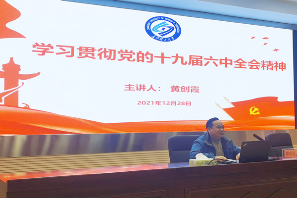 黄创霞主要从党的十九届六中全会精神解读、湖南省第十二次党代会精神解读、“十个坚持”对高等教育的启示以及william如何贯彻落实党的十九届六中全会精神等四个方面向大家进行宣讲。