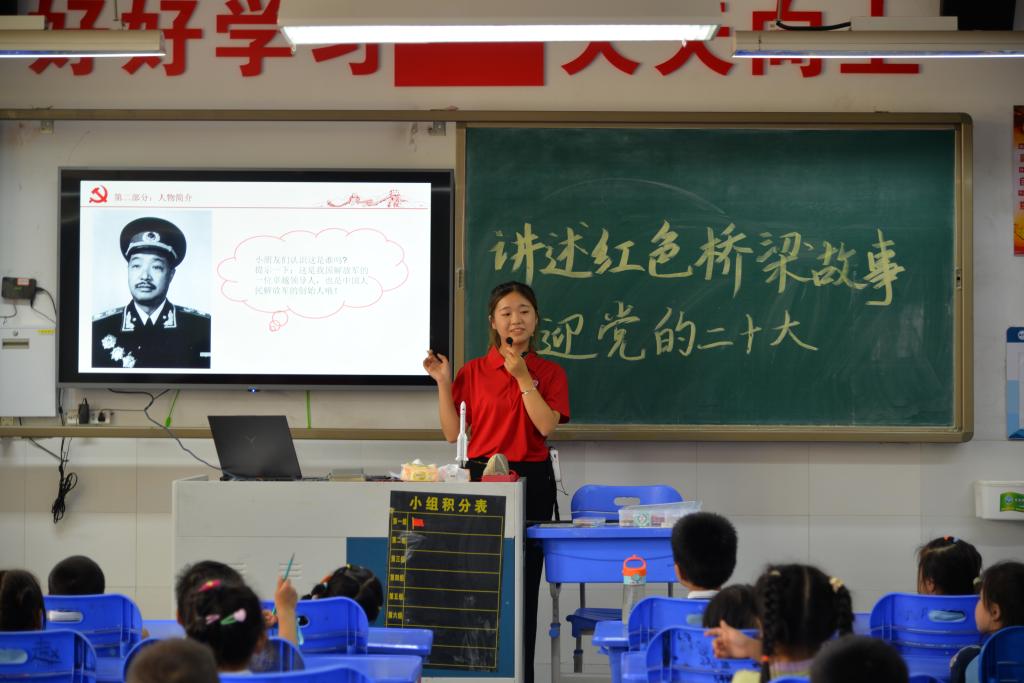 宣讲队成员彭翔宇,向小朋友们展示了事先用木条做好的桥梁,在宣讲团成员的带领下,小朋友们纷纷开始搭建自己心目中的“红桥”。“当我得知要去小学开展红色教育宣讲时,我第一时间便想到了让小朋友搭建‘红桥’这个环节,这样既不会因空洞的说教而使宣讲效果大打折扣,还将红色文化的种子以小朋友喜闻乐见的方式播撒在他们心中。”彭翔宇这样说道。