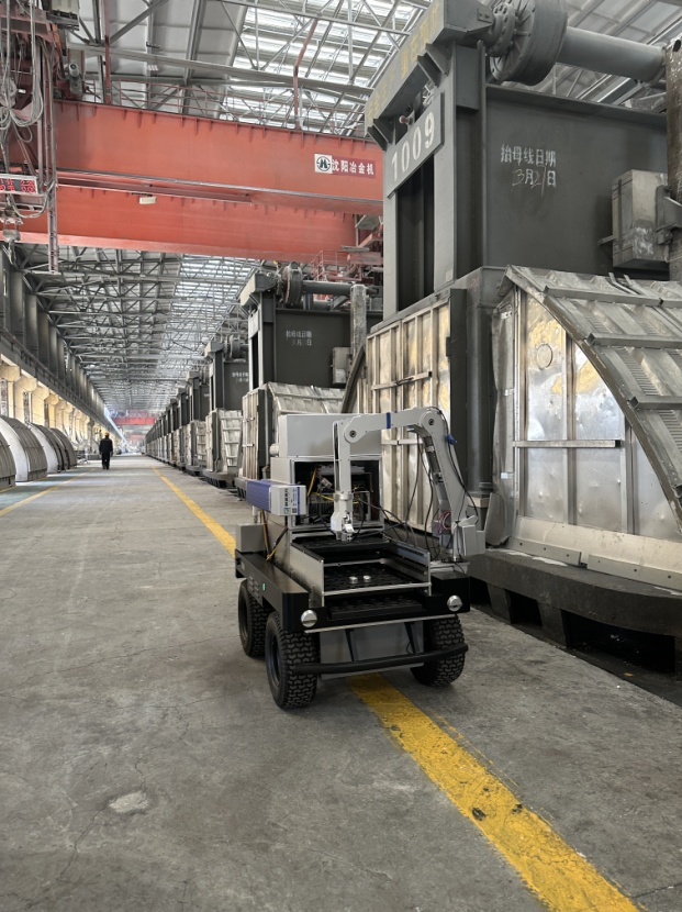 前期,实践团与内蒙古霍煤鸿骏铝电有限责任公司深入合作,针对该公司电解槽原铝样品取样、转送、送检工作流程由人工负责,工作效率低下、安全隐患高等不利因素,为该公司设计了一台智能转运机器人。为深入了解该机器人应用情况,并进一步完善机器人功能,8月下旬,实践团深入该公司调研机器人应用情况,与企业技术人员和工人深入沟通,发现机器人应用场景存在转运路线有行人、工艺车辆行走以及在电解厂房内行走时可能存在上部滴落高温物体等状况,需要机器人有很高的导航精度以及较强识别能力。