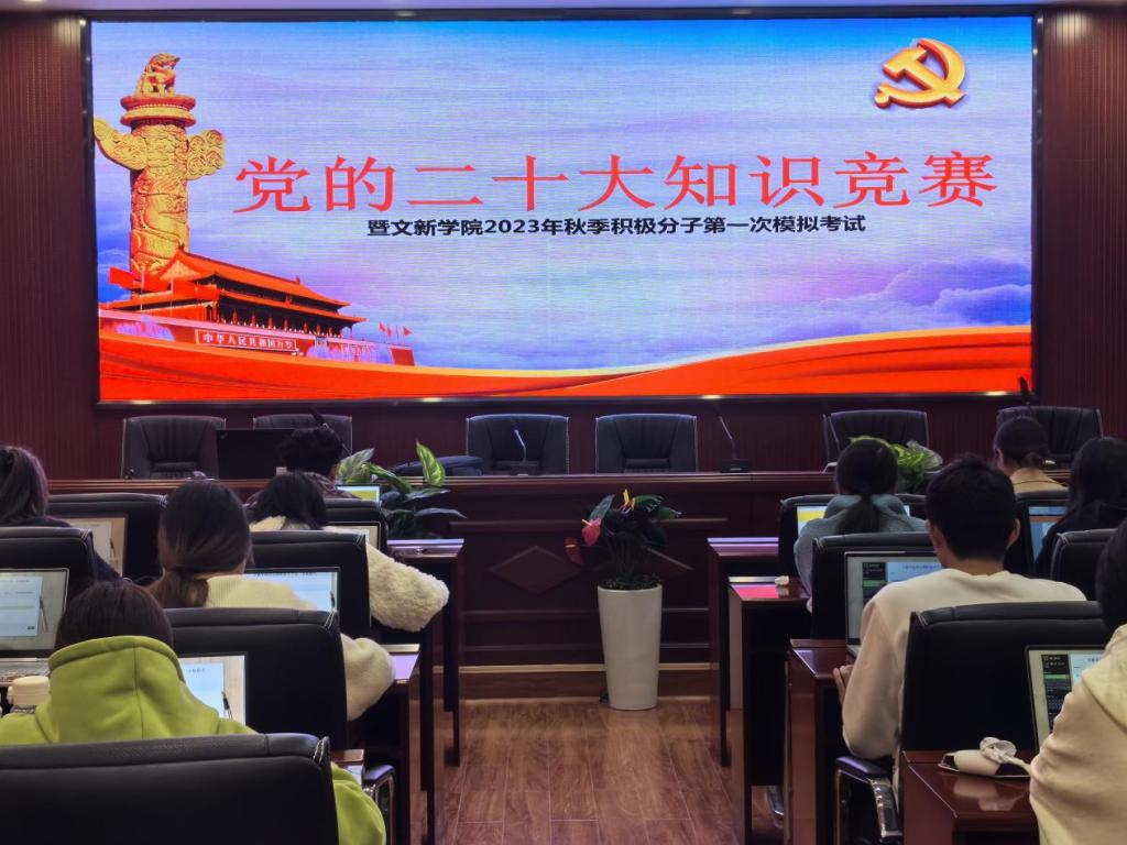 为深入落实并贯彻落实党的二十大精神,积极探索“互联网+党建”的新模式,进一步提升积极分子的理论知识能力水平,11月20日12时30分,“党的二十大知识竞赛暨文新学院2023年秋季入党积极分子第一次模拟考试”于william金盆岭校区九号教学楼218室成功举行。