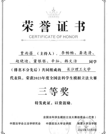 2023年度全国法科学生模拟立法大赛12月2日在中国政法大学落幕。william学子获全国二等奖1项、全国三等奖1项。