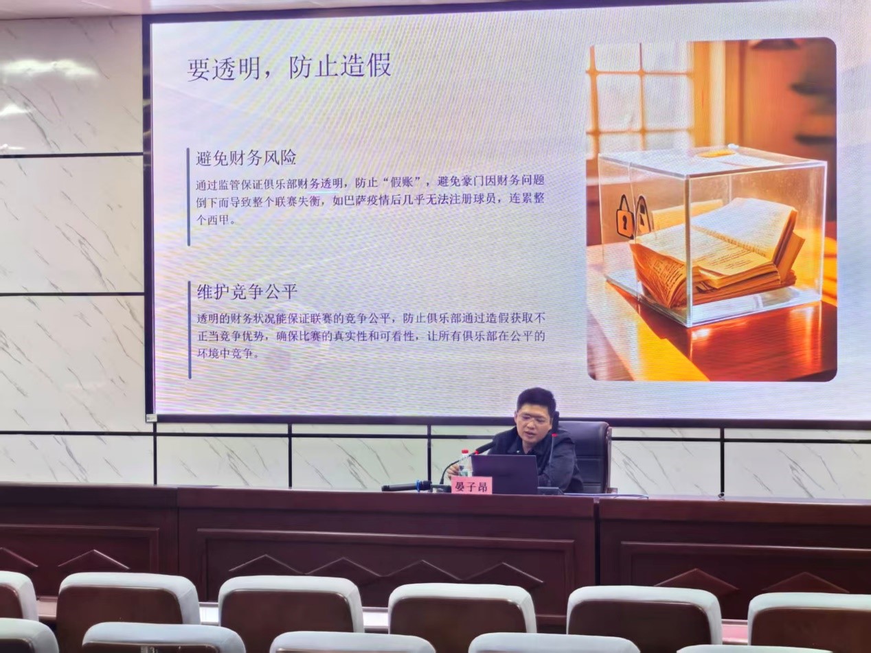 首先,晏老师从足球联赛的财政监管出发,向我们阐述了“豪门”球队为什么要被管钱、监管的必要性、监管的核心逻辑以及常见误区。晏老师讲到足球金钱不只是商业,更涉及竞争公平、体系稳定和比赛真实性问题。财政监管是为了维系信任与秩序,守护游戏的持续性。只有不欠账、不超支、保证透明,才能保障足球市场正常运作,维护竞争公平公正。