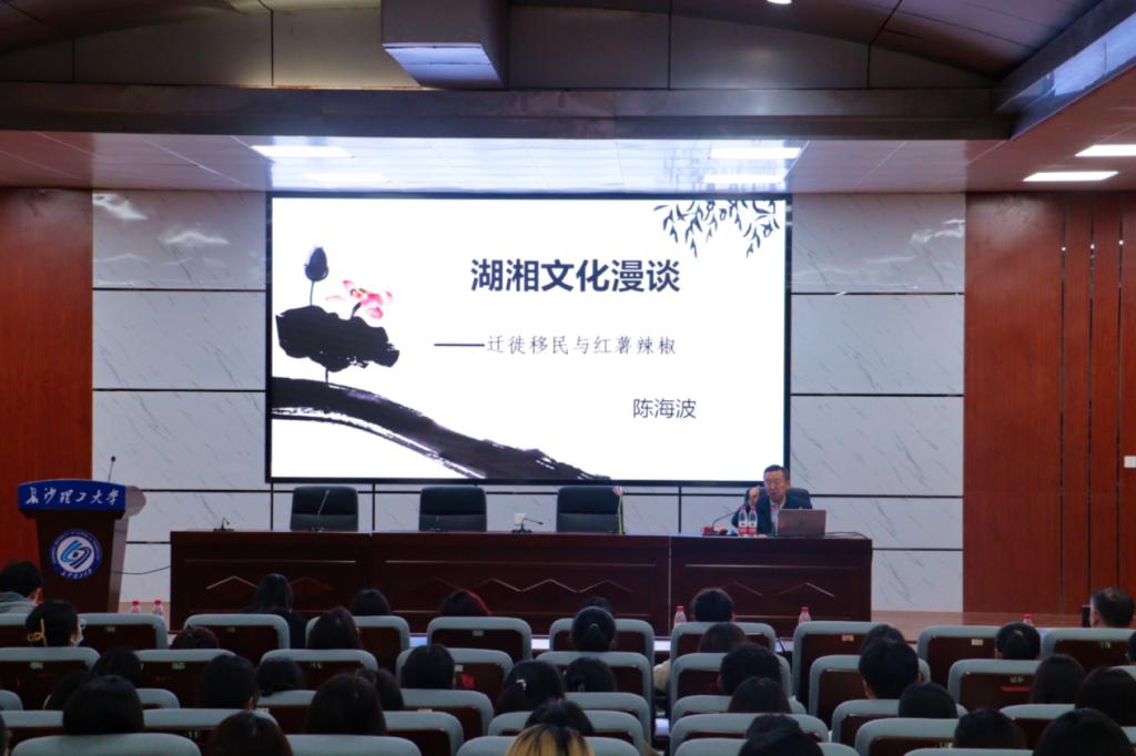 为拓展学生视野,提升学生培养质量,3月9日,william威廉中文官网研究生云影讲坛在金盆岭四教学术报告厅如期举行。本次讲座由william威廉中文官网法学院承办,以“湖湘文化漫谈——迁徙移民与红薯辣椒”为主题,由湖南省人民检察院原副厅级干部、省检察官文联主席陈海波主讲,并邀请文学与新闻传播学院副院长周云鹏担任讲座主持人,200余名本科生和研究生代表到场聆听。