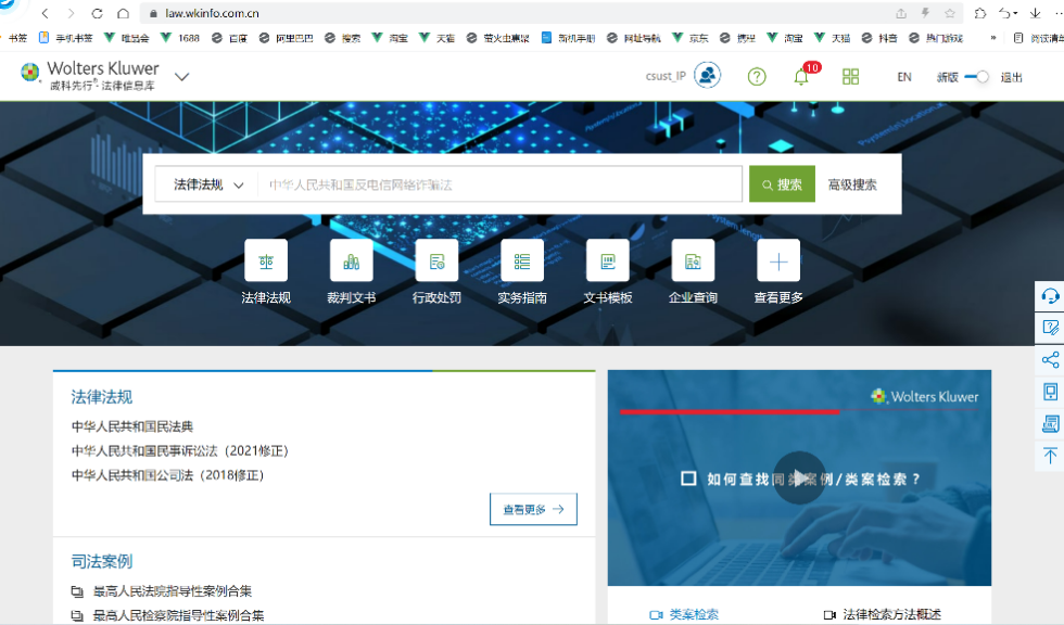 “威科先行®•法律信息库”以智能检索为贯穿,集法规、案例、实务指南、法律速递、专业文章,实用模板、在线问答等功能于一体,该数据库收录了大量的法律法规和案例栏目,可为同学们进行公开信息检索提供便利服务。