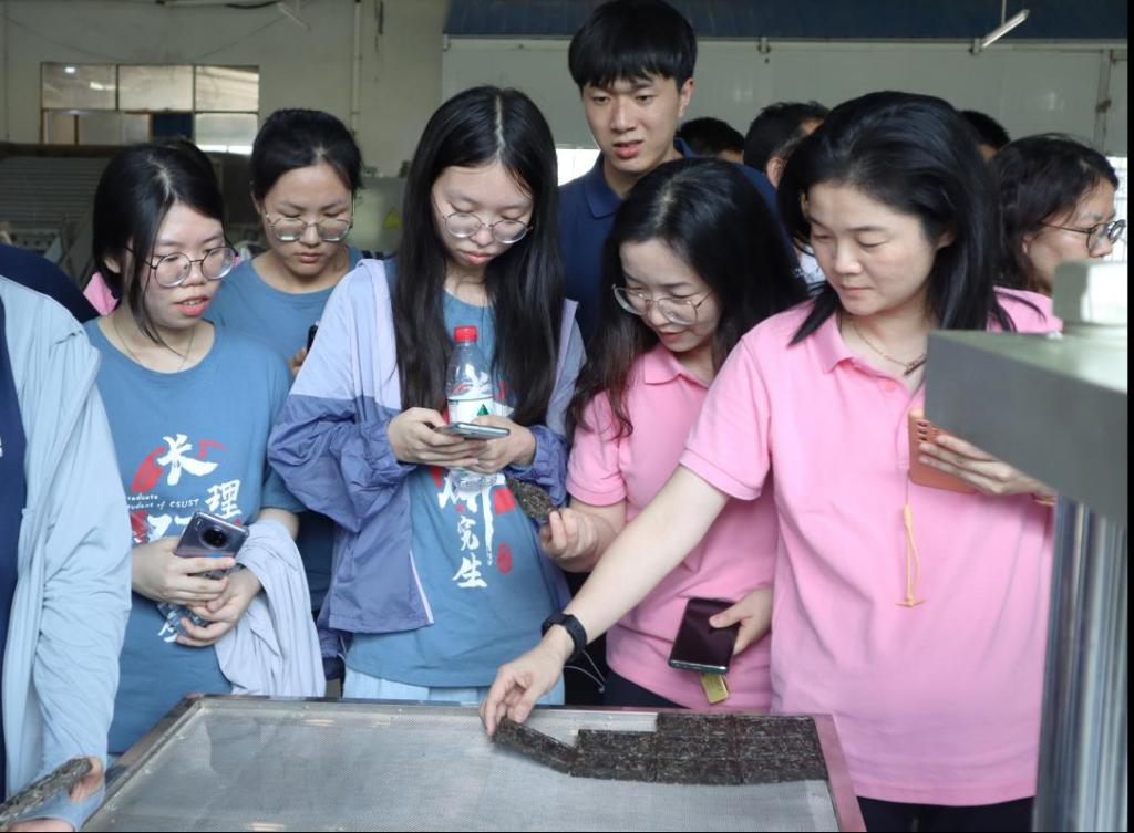 参观前,茶艺师为师生们冲泡了古树白茶、桑植白茶“风、花、雪、月”系列产品,同时讲解了“桑植白茶”背后的多彩文化和民俗风情。而后,实践团跟随湖南省人大农业与农村委员会法案调研处处长刘帅、桑植县农业农村局副局长彭勇、湖南湘丰桑植白茶有限公司总经理黄骁等一起走进茶叶加工车间,进一步了解桑植白茶精制加工产品的加工工艺、生产流程、存储方式、创新研发及销售模式及发展需求等。