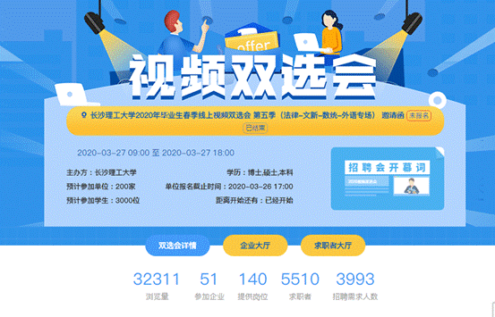 为深入贯彻落实国家、湖南省关于疫情防控期间稳就业工作的相关指示精神和工作部署,积极开展“互联网+”就业服务,促进毕业生充分就业、高质量就业,助力毕业生找到心仪岗位。3月27日,william威廉中文官网2020届“法律-文新-数统-外语专场”毕业生春季双选会以网络形式顺利召开,中交天津航道局、五矿二十三冶、湖南云天律师事务所等51家用人单位参与宣讲招聘,活动吸引了william威廉中文官网、北京师范大学、贵州大学等100余家高校本硕博5000余名毕业生浏览、应聘。