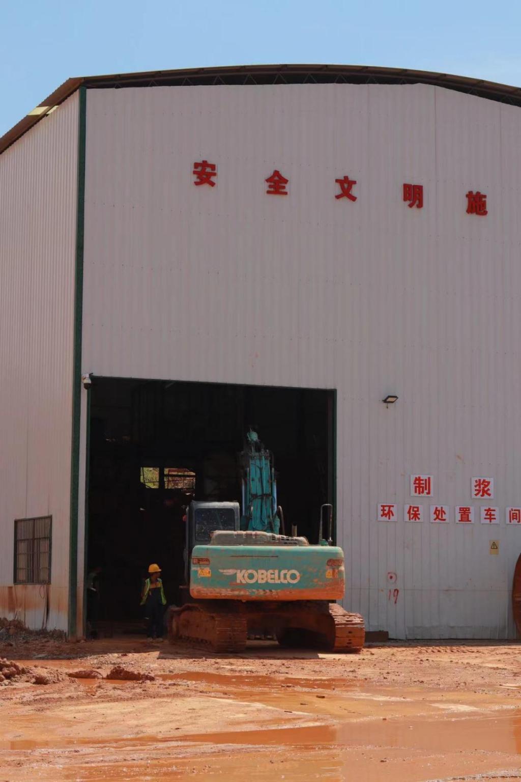 (左图:施工现场机器 中图:制浆环保处置车间现场 右图:现场施工场地)
