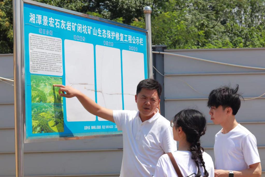 实践团走进湘潭景宏石灰岩矿,项目负责人具体向实践团介绍了矿山生态修复的方案和流程。针对闭坑矿山,经湘潭相关部门多方协商,结合地质灾害的治理和土地未来利用规划,构建了以“分区治理”“人工生态修复”为主的治理路径,推出“地上复绿”“地下填充”的绿色治理创新之举。