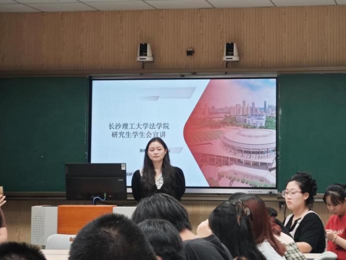 最后,法学院研究生会主席陈珮瑶对新生进行了招新宣讲,从研会是什么、研会做什么、为什么加入研会这几方面展开,详细介绍了院研会的部门风采和工作成果。