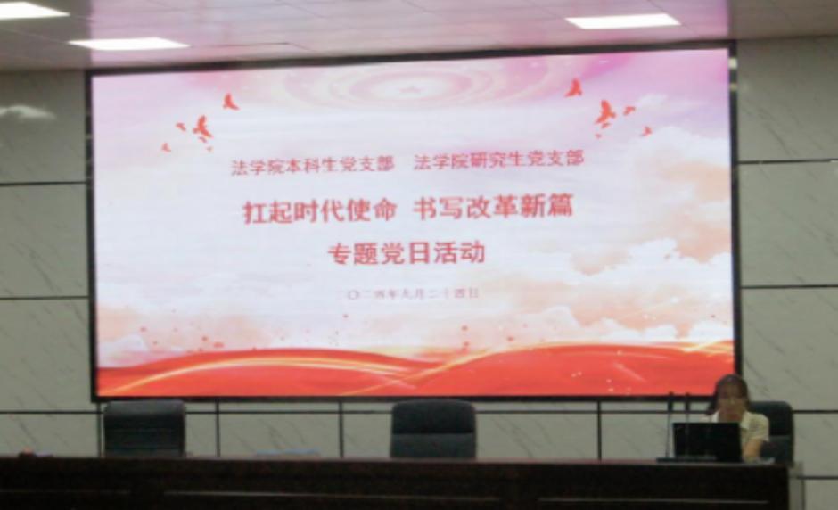 为进一步加强党员党性修养,提升党员综合素养,法学院学生党支部于9月24日下午举行了“扛起时代使命,书写改革新篇”主题党日暨第一堂党课活动,活动由党支部副书记尹亮主持,法学院全体学生党员和2024级研究生参加。