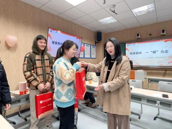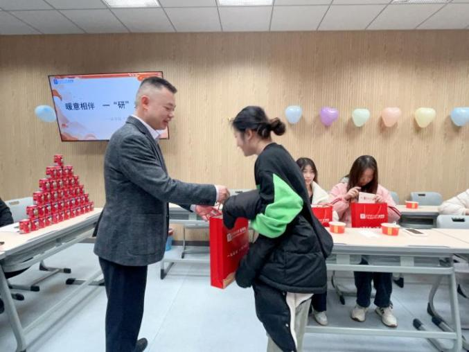 活动最后,龚文斌和张敏纯为每一位考研同学发放了“考研福袋”,福袋使用红色手提袋包装,表面印有“一战成硕,一研为定”的祝福语。福袋中装有“心想事橙”甜美橙子、“柿柿如意”好运挂件、“运气旺旺”旺仔牛奶、“暖身、暖心又暖胃”的暖手宝、祝福卡片和零食等,饱含着学院师生对考研学子的关心与祝福,鼓励每一位备考同学以昂扬的斗志和积极的心态坚持到最后一刻。