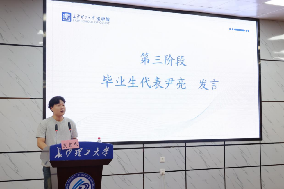 “最后一课”在庄严的国歌声中拉开序幕。在校生代表胡嘉玥深情回顾了自己在法学院的成长经历,分享了与毕业生们的点点滴滴,感恩学长学姐们的帮助与启发。“轻舟已过万重山,前路必是朝阳万里”,她以诗意语言表达了对毕业生们的美好祝愿。