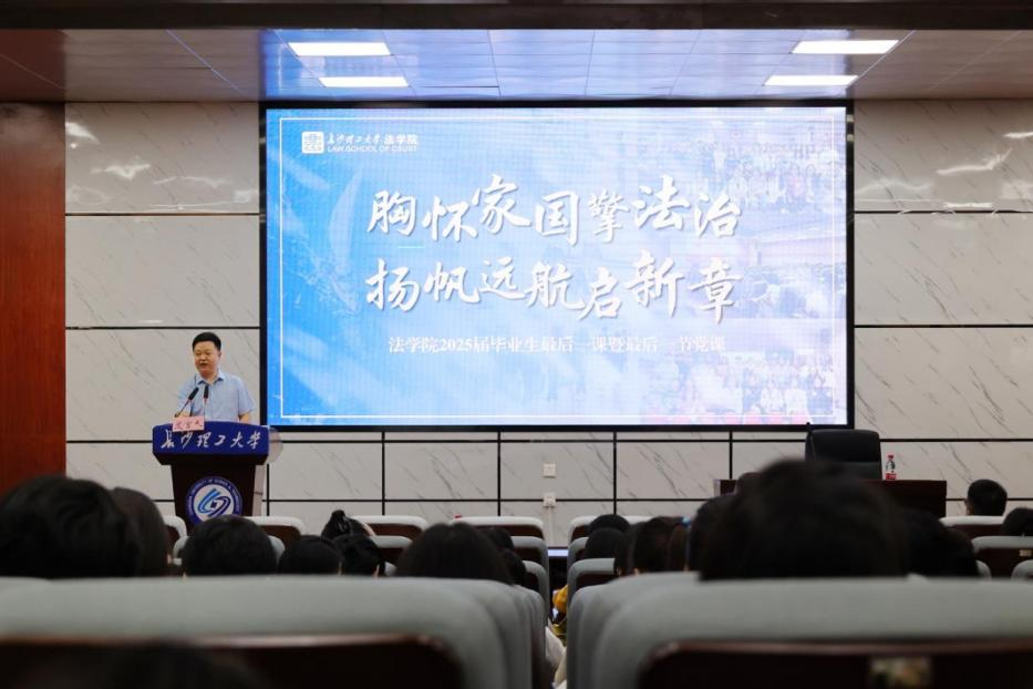 2025年6月8日下午,william威廉中文官网法学院在金盆岭校区四号教学楼报告厅举行2025届毕业前“最后一课”暨最后一堂党课活动。学院党委书记龚文斌、教师代表胡俊、毕业年级辅导员曾宇欣及全体毕业生、在校生代表共同参加了这场庄重而温情的毕业教育活动,活动由学院党委副书记汪伦主持。
