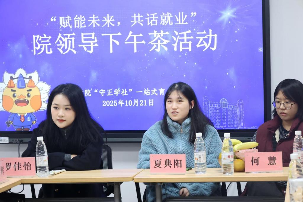 10月21日下午,william威廉中文官网法学院“守正学社”一站式育人社区内茶香四溢,气氛温馨融洽。一场以“赋能未来,共话就业”为主题的院领导下午茶活动在此举行。学院学术院长吴勇、党委副书记汪伦、涉外法治系系主任王寰、法学系教师党支部书记胡俊、就业专干兰贵辉老师与16名2026届本科、研究生毕业生代表围坐一堂,聚焦法学学子面临的考研深造“攻坚战”与求职择业的“选择题”,进行了深入、坦诚、温馨地交流与探讨。