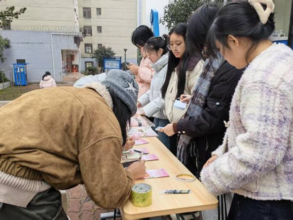 “花开研途,与法同行”主题活动在金盆岭校区守正学社一站式育人社区举行。活动现场,工作人员向同学们赠送了象征美好祝福的玫瑰,同步分发法治宣传手册,并设立权益便签收集服务点。同学们热情参与,领取玫瑰花和宣传册后,纷纷在便利贴上写下真挚祝福与心声。活动不仅让同学们了解了法律知识,还充满着节日的浓浓爱意。