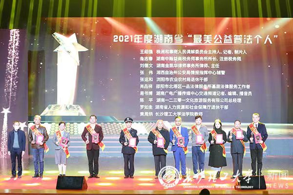 我院教师、中国民主建国会长沙市委副主委黄周炳获评2021年度湖南省“最美公益普法个人”。长期以来,黄周炳老师坚持开展普法宣传工作,指导学生成立“法学协会”“法律咨询社”等学生社团,长期指导学生开展法治宣传系列实践活动,经常组织开展校园普法讲座,邀请明星警官现身说法,指导制作校园普法系列栏目剧“小权说法”,构建了“长理法律宣传月”品牌。他还坚持用法律知识服务社会,定期义务开展法律知识讲座,带领学生深入社区进行法律知识宣传,无偿为弱势群体维权,先后为困难企业提供法律援助30余次,挽回经济损失近5000余万元,义务提供法律咨询1000余次,免费给30多个单位讲授法治课50多场次。同时他积极履行长沙市人大代表职责,提出关于“加强企业法治环境,实现亲清政商关系法治化”的建议得到省市领导批示。