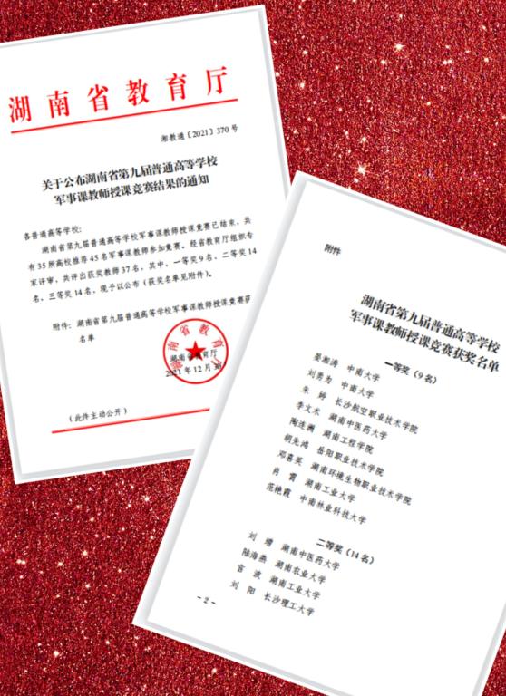 近日,省教育厅正式发文公布湖南省第九届普通高等学校军事教师授课竞赛成绩,william法学院刘阳、文新学院楚艳鸽分别荣获二等奖和三等奖。