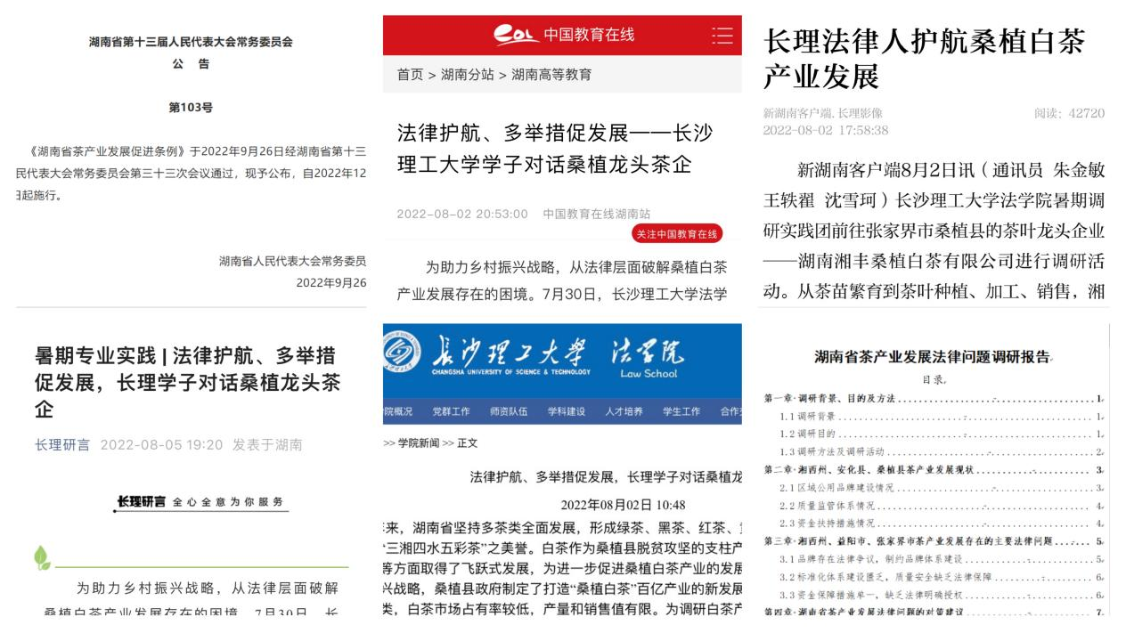 在近两个月的准备、实践、研究过程中,实践团成员在指导教师张敏纯老师、徐莉老师的带领下,先后前往湘西土家族苗族自治州、益阳市安化县、张家界桑植县,聚焦地区茶产业发展的品牌建设、质量管控及资金扶持措施等关键环节,通过问卷调查、座谈会、实地走访等方式,了解产业现状、探索产业发展“痛点”,从法律角度进行诊断,提出具有针对性、可操作性的建议,并通过“直通车”的形式呈报省农业农村厅、省司法厅及省人大,得到《湖南省茶产业发展促进条例》的部分采纳和吸收。实践团最终形成的《湖南省茶产业发展法律问题调研报告》,亦为《湖南省茶产业发展促进条例》的贯彻实施提供了实践依据和理论支撑,满足湖南省茶产业高质量、可持续发展的现实需求。相关调研成果也得到《中国教育在线》《新湖南》等新闻媒体的报道与转载,实现良好的成果推广。
