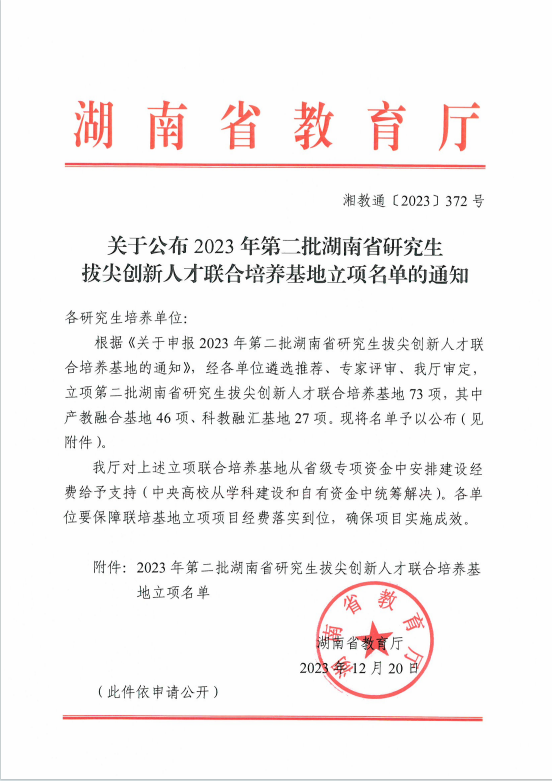 2023年12月20日,湖南省教育厅发布了《关于公布2023年第二批湖南省研究生拔尖创新人才联合培养基地立项名单的通知》,“william威廉中文官网-工程法研究生拔尖创新人才联合培养基地”项目成功获批立项。这是我院获批成立的首个省级研究生人才培养基地。