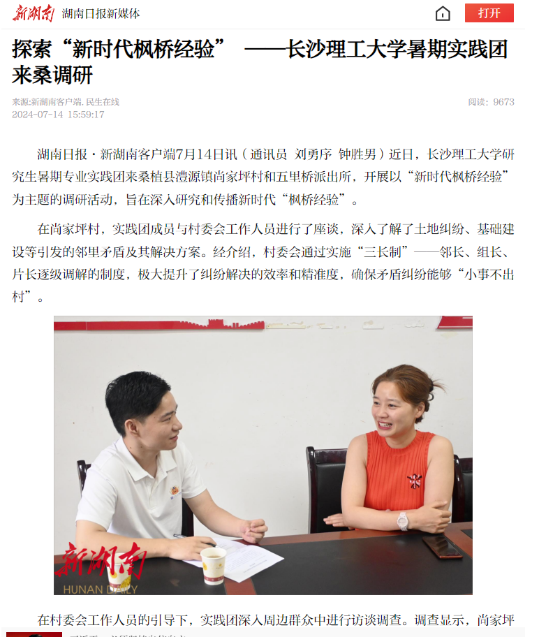 新时代“枫桥经验”组在李殊、曾雨欣老师的带领下,赴桑植县深入一县四镇十村,开展了关于“新时代枫桥经验”的调研与宣讲实践。学生们直插居民纠纷调解第一线,与村务人员、乡贤及村民面对面交流,深入了解基层矛盾化解机制和“枫桥经验”的生动实践。通过问卷调查、深度访谈等方式,实践团收集了大量关于基层治理和法治建设的一手资料,为推进基层治理体系和治理能力现代化提供了有益参考。