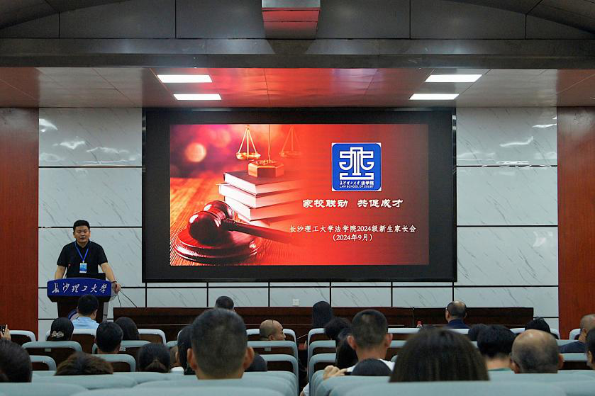 为加强家校沟通交流,共同促进新生尽快完成角色转变、适应大学学习生活。2024年9月15日上午,法学院在金盆岭四教报告厅隆重举行2024级新生家长会,会议由24级新生辅导员兰贵辉主持,学院党委书记龚文斌、院长张敏纯、党委副书记汪伦、副院长申纯出席,百余名新生家长现场参与。
