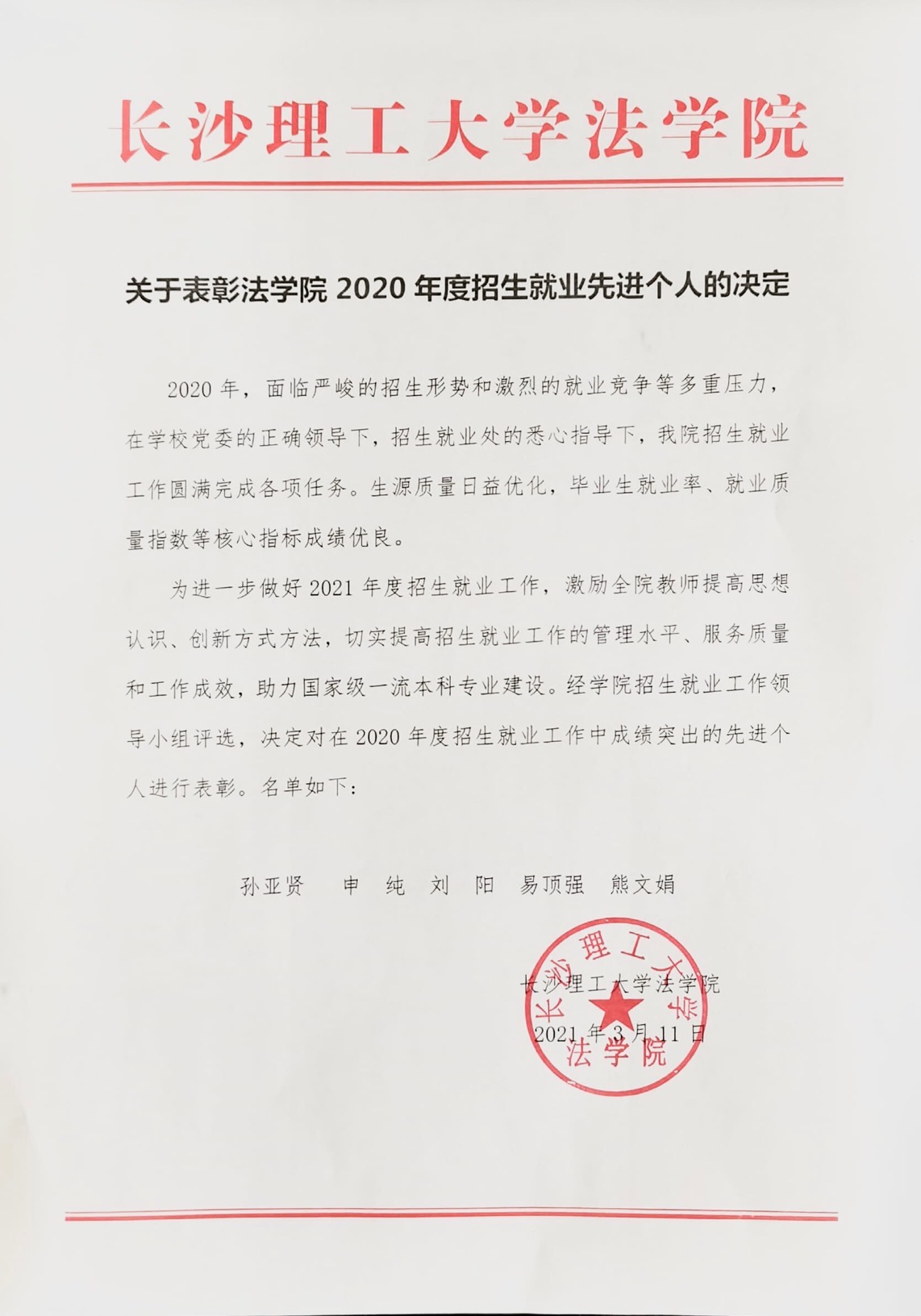 关于表彰法学院2020年度招生就业先进个人的决定