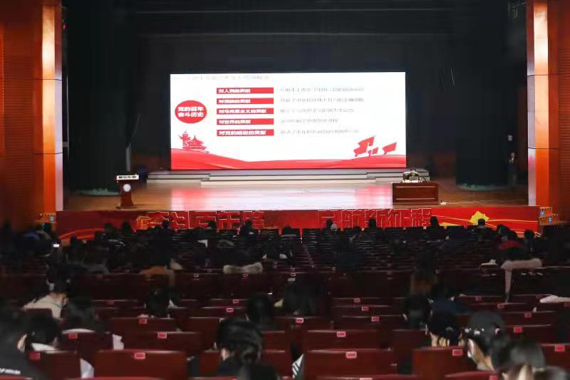 12月21日下午,校党委委员、副校长蒋璟萍在云塘校区大会堂为法学院、外国语学院、马克思主义学院三个学院师生一千余人宣讲党的十九届六中全会和湖南省第十二次党代会精神,外国语学院党委书记文丽丽主持会议。