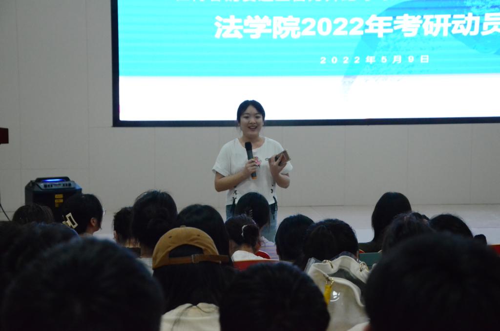 为提高我院2023届学生考研热情,充分调动学生考研积极性,帮助学生认清当前考研新形势,树立考研自信心,明确考研目标,营造良好的考研氛围。5月9日晚,法学院在文科楼圆厅召开2023届学生考研动员大会。院长张敏纯,党总支副书记汪功伟,副院长申纯、徐莉,毕业班全体班主任及辅导员、2022届考研上岸学生代表、2023届全体学生参加会议。